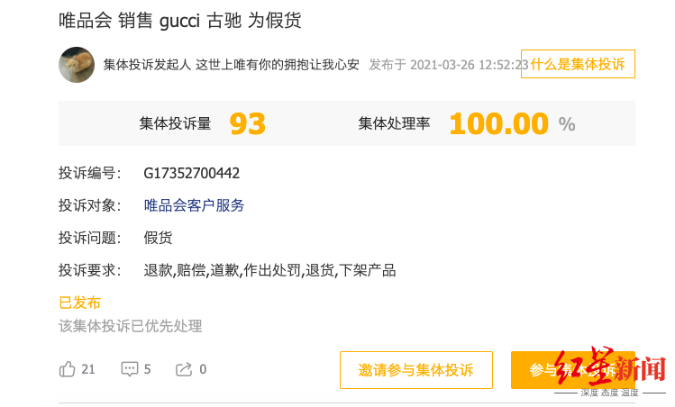截至4月6日,“唯品会Gucci售假维权群”已有140余人,涉及金额达33万元。记者了解到,有部分消费者已经向广州互联网法院提起诉讼申请,要求唯品会假一赔三并道歉。