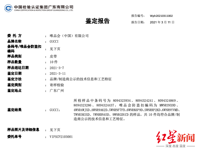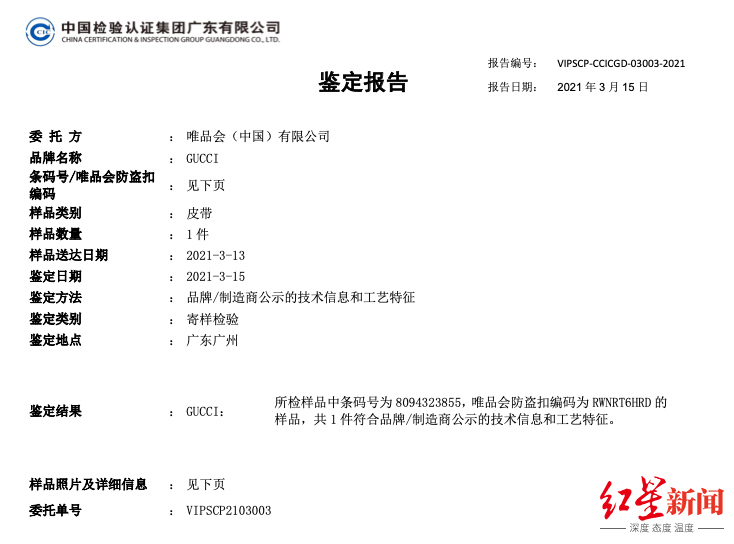 对于消费者反映在得物APP、优奢易拍等平台鉴定为假的情况,唯品会公关负责人表示,这批Gucci腰带在售卖之前已经送到中检集团进行抽检,并向记者展示了两份由中检集团广东有限公司出具的鉴定报告。报告显示,唯品会于3月7日、3月15日将11条Gucci腰带送到中检广东公司进行抽检,鉴定结果均为“符合”。