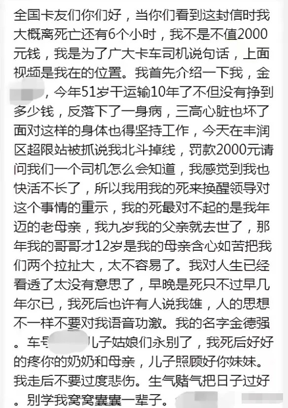 2000元罚款,对某些人可能算不上大数目,但对另一些人来说,可能就成了压死骆驼的最后一根稻草。4月5日,51岁的货车司机金某驾车经过唐山丰润区时,被当地超限站执法人员拦下,被以车载北斗系统掉线为由扣车并罚款2000元。金师傅对此不服,在当天饮下农药自杀,并留下遗言称“我用我的死来唤醒领导对这个事的重视”。