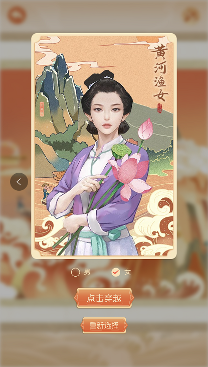除了“黄河渔夫”、“黄河渔女”,在“换装穿越”板块,共有12个不同身份、职业的服装和场景等你来体验,板块分为“一步千年”和“辉煌百年”两部分,让网友深入体验千年古国的厚重历史与建党百年党史。