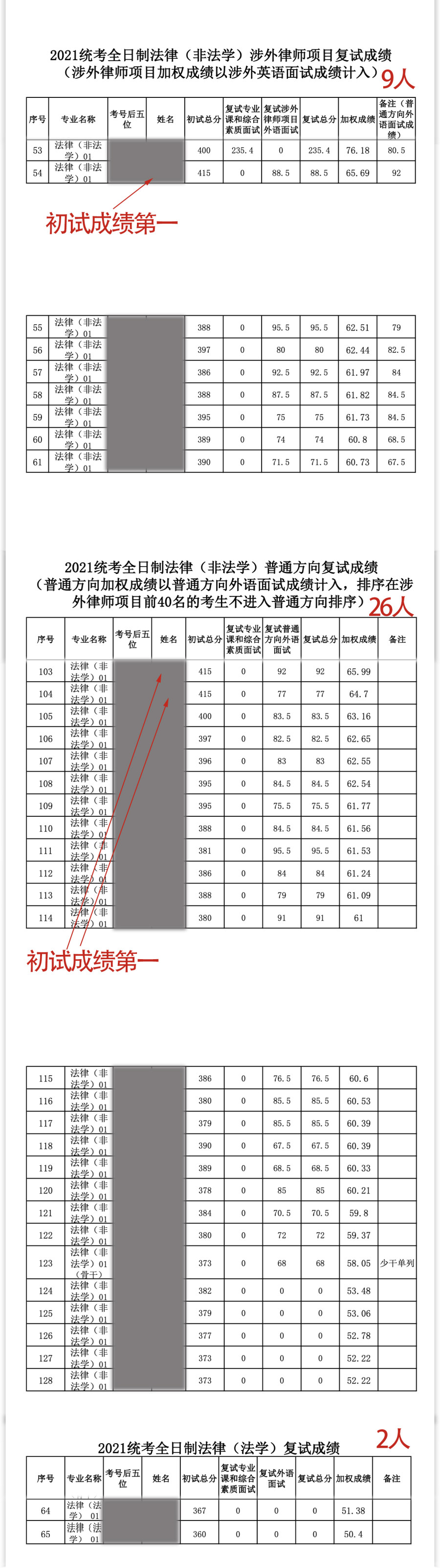 其中全日制(非法学)涉外律师项目复试的9人中单项科目均为0分;全日制法律(非法学)普通方向参与复试的26人中,有21人复试专业课和综合素质面试为0分;全日制法律(法学)参与复试的2人复试所有科目成绩均为0分。