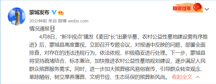 据安徽@蒙城发布 消息,4月8日,“新华视点”播发《麦田“长”出豪华墓,农村公益性墓地建设需有序推进》后,蒙城县高度重视,立即召开专题会议,对报道中反映的问题,部署全面排查,对存在的违法违规行为,依法依规、积极稳妥进行处理。下一步,蒙城县将坚持疏堵结合、标本兼治,加快推进农村公益性墓地规划建设,逐步满足人民群众殡葬服务需求。同时,进一步加大殡葬移风易俗宣传,引导群众转变观念、革除陋俗,树立厚养薄葬、文明节俭、生态环保的殡葬新风尚。