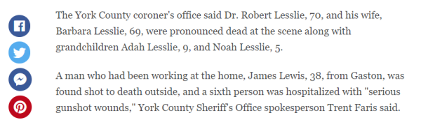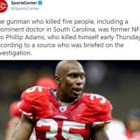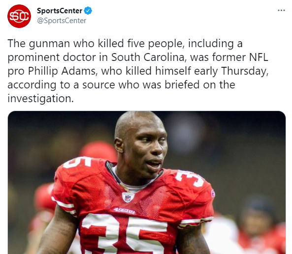 根据美联社的介绍,这名行凶的退役球员名叫菲利普·亚当斯,32岁,曾在美国职业橄榄球大联盟效力多年,但也受过很多伤,比如脑震荡和脚踝骨折。当地警方称,被他枪杀的5人包括一名医治过他的70岁的知名医生,该医生69岁的妻子,以及两人的9岁和5岁的孙辈。一名在这名医生家中工作的38岁男子,也被射杀在了医生家的外面。还有一人正因严重的枪伤在医院抢救中。亚当斯自己则在行凶后的次日凌晨自杀。