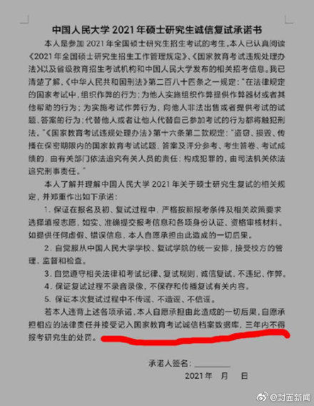 4月7日,中国人民大学发布了法学类研究生的拟录取名单,34名考生复试成绩0分,其中包括初试第一的高分考生。有网友爆料称,多名被判0分的考生系涉嫌“泄题”,考完后在群聊中透露复试试题和流程,而此时复试仍在进行中。对此,中国人民大学法学院一工作人员表示,确有0分考生存在的情况,但并不清楚是否是因“泄题”导致的处罚。