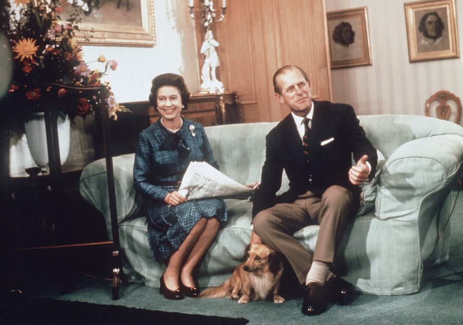 1975年,巴尔莫勒尔堡,伊丽莎白二世女王和爱丁堡公爵菲利普亲王与爱狗合影。