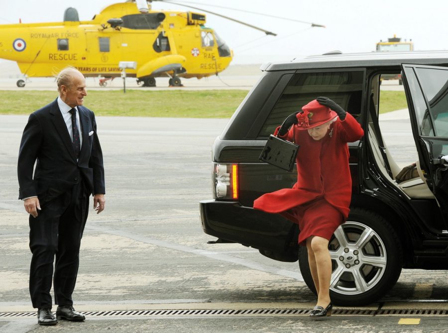 当地时间2011年4月1日,英国威尔士,英国女王伊丽莎白二世到安格尔西岛看望在皇家空军基地服役的孙子威廉,途中不时以手护住帽子,以防被风吹跑。见此情景,一旁的菲利普亲王笑了起来。