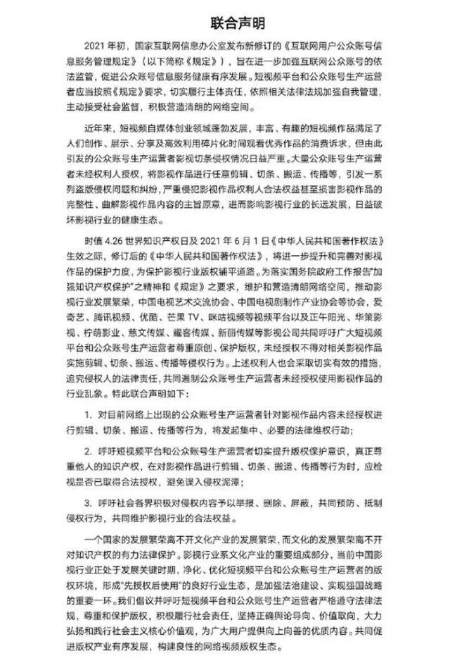 4月9日,多家协会、视频平台及影视公司发布联合声明,共同呼吁广大短视频平台和公众账号生产运营者尊重原创、保护版权,未经授权不得对相关影视作品实施剪辑、切条、搬运、传播等侵权行为。