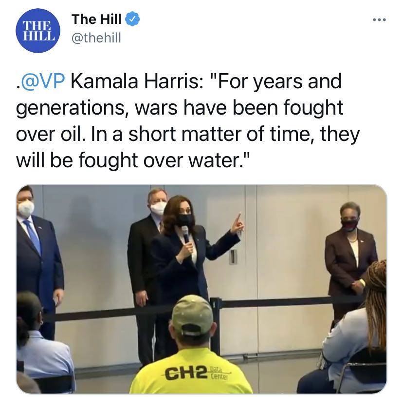哈里斯:“我参加过很多次外交政策会议,要知道过去很多年,几代人都在为石油而战,而在不久的将来将会为水资源而战。”