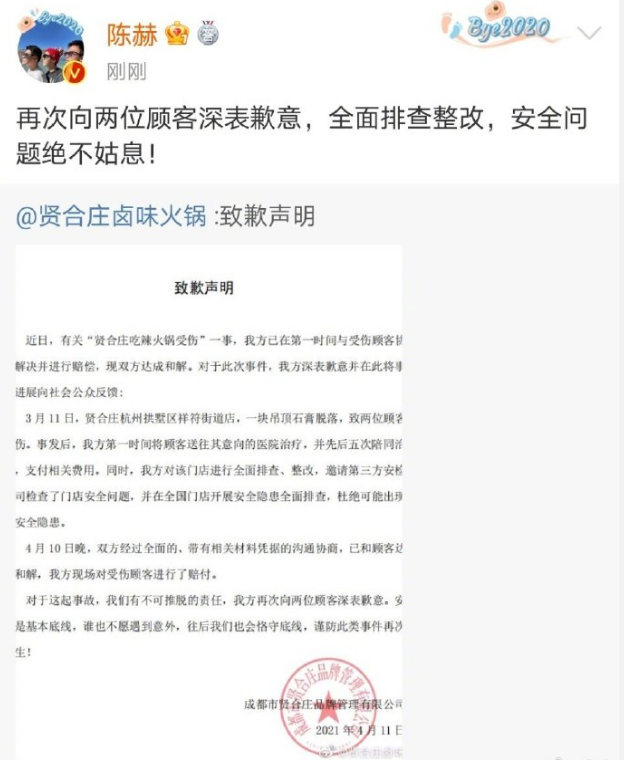 11日晚,陈赫火锅店“贤合庄”发布声明,表示已经第一时间将顾客送往其意向的医院治疗,并先后五次陪同治疗支付相关费用,同时邀请第三方安检公司在全国门店开展了安全隐患全面排查,杜绝可能出现的安全隐患。目前已与顾客达成和解,对受伤顾客进行赔付。随后陈赫本人转发微博道歉。
