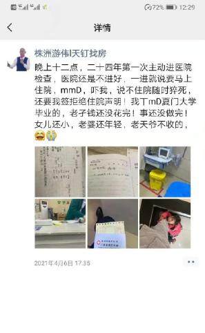 据其 4 月 6 日发布的朋友圈,4 月 6 日凌晨,游某曾前往医院,医院要求游某马上住院,但游某拒绝住院。他称“ 他厦门大学毕业的,钱还没花完,事还没做完,女儿还小,老婆还年轻,老天爷不收的。” 其朋友圈一张检查报告单显示“窦性心律、T 波异常(可能是前侧壁心肌缺血)、异常心电图”。另外一张图则显示,“拒绝住院 游某”。