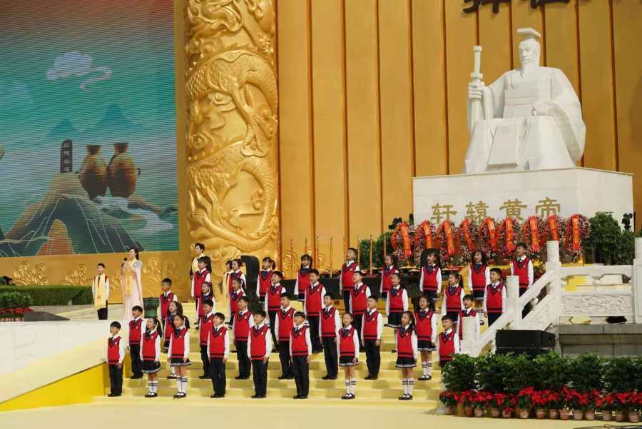 “大风起兮云飞扬,吾土吾心吾欢畅,四海之内皆和谐,吾思吾梦吾向往……”著名歌唱家和现场青少年合唱团一起高声吟唱黄帝颂歌。