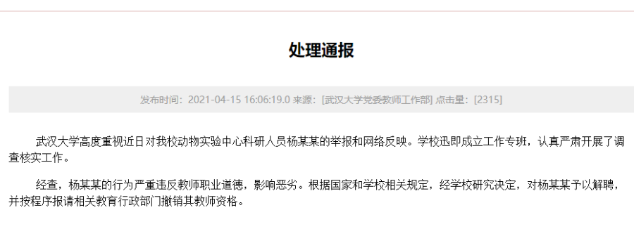 武汉大学高度重视近日对我校动物实验中心科研人员杨某某的举报和网络反映。学校迅即成立工作专班,认真严肃开展了调查核实工作。