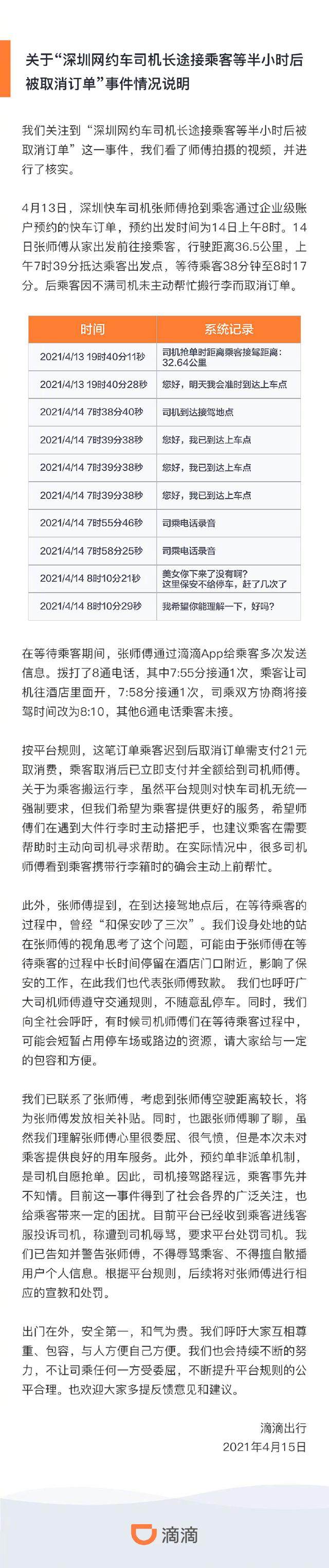 15日,@滴滴出行 回应,乘客迟到后取消订单立即支付给司机21元赔偿。平台对快车司机无强制要求。考虑到张师傳空驶距离较长,平台将为张师傅发放相关补贴。此外,平台收到乘客对司机的举报,后续将对其进行相应的宣教和处罚。