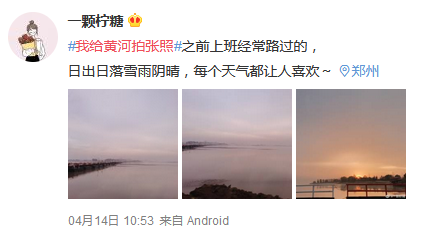 “我的家乡,陪我长大的黄河。 ”“上班经常路过的黄河,日出日落雪雨阴晴,每个天气都让人喜欢。”“那是我从小长大的地方,每次回家总要到黄河边转转,转眼间到了外地上学,看见黄河,我就想起了我的家。”……