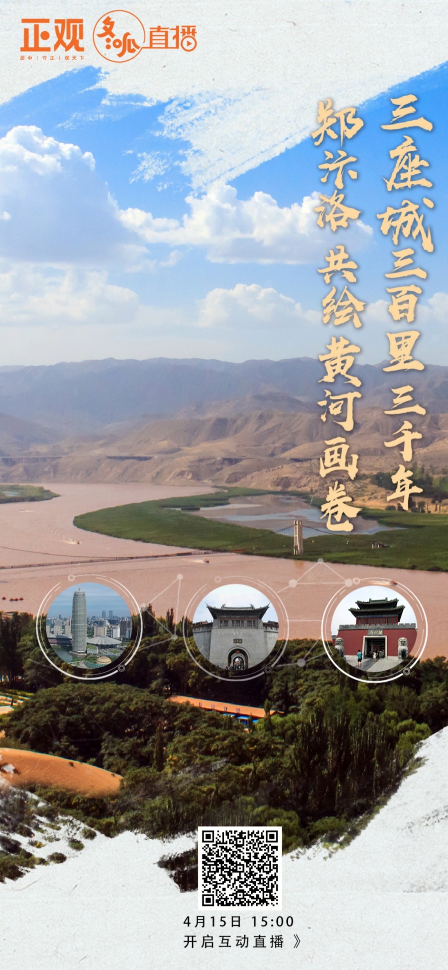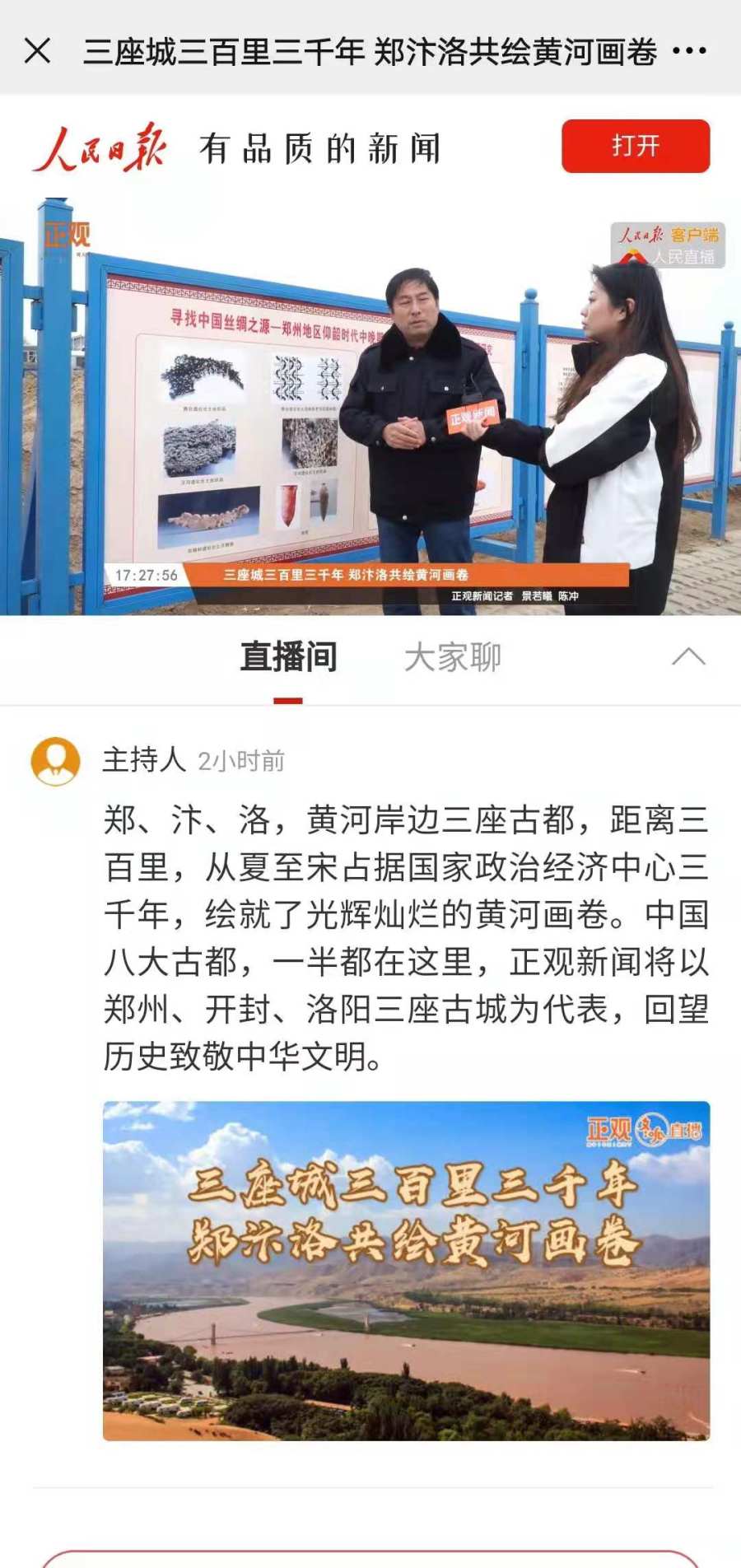 郑、汴、洛,黄河岸边三座古都,距离三百里,从夏至宋占据国家政治经济中心三千年,绘就了光辉灿烂的黄河画卷。在《三座城三百里三千年,郑汴洛共绘黄河画卷》直播中,以郑州、开封、洛阳三座古城为代表,走进郑州双槐树遗址、开封州桥遗址和洛阳应天门遗址,回望历史致敬5000年中华文明。截至直播结束,共收获318万观看量。