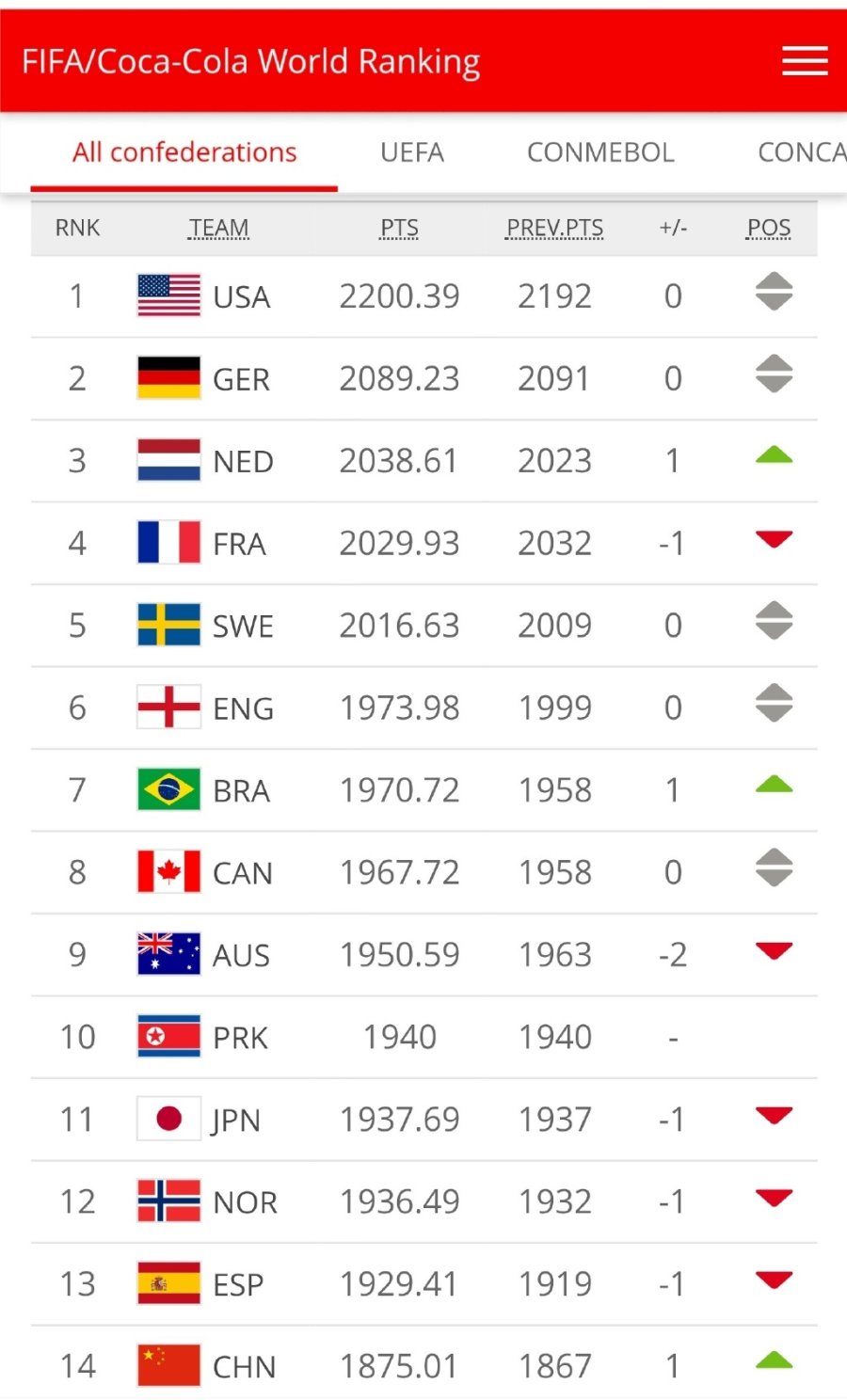 @人民日报体育 4月16日消息,今日,国际足联更新了最新一期的女足国家队世界排名。刚刚淘汰韩国女足进军东京奥运会的中国女足积1875.01分排在世界第14位,较上期排名上升一位。在亚足联球队排名中,中国女足排在澳大利亚女足、朝鲜女足和日本女足之后,位列第四。