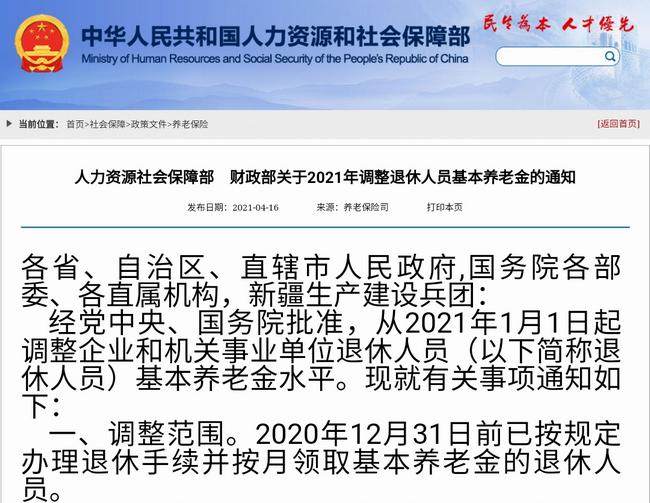 《人社部和财政部关于2021年调整退休人员基本养老金的通知》截图。