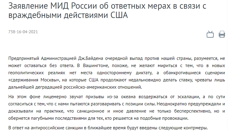 声明表示,美国似乎不愿意接受这样一个事实,即在新的地缘政治现实中单边强权已无一席之地。美国继续短视地搞“遏制莫斯科”这一套,只能导致俄美关系进一步恶化。在此背景下,来自大洋彼岸有关“避免冲突升级”的呼吁极度虚伪,事实上美国企图使俄罗斯认同美方“从实力的立场”与俄方对话。施加制裁等压力不仅是徒劳的,而且还将对挑衅者本身造成灾难性后果。俄罗斯不可能不对美国拜登当局对俄的攻击做出回应。