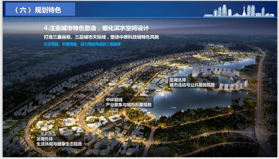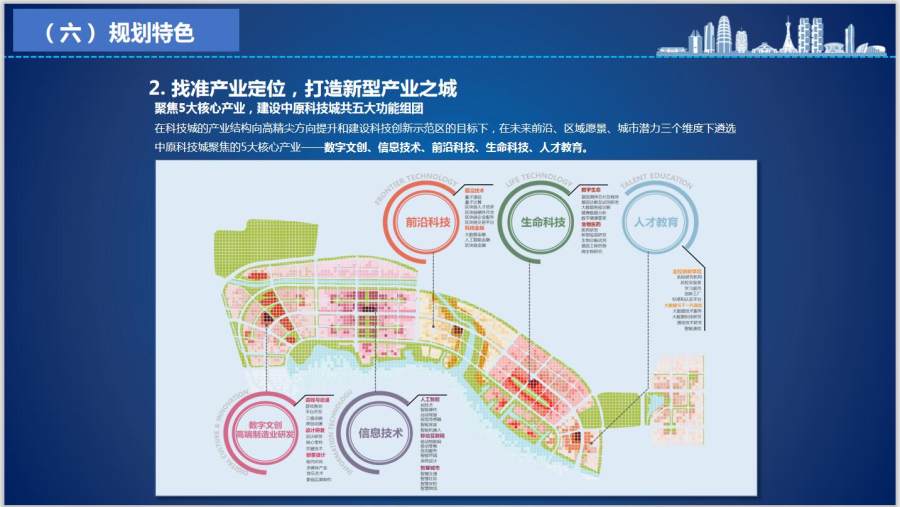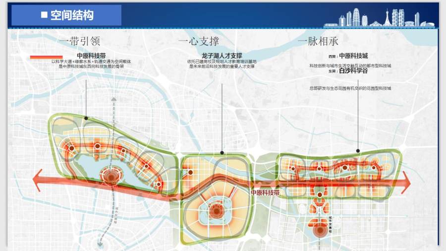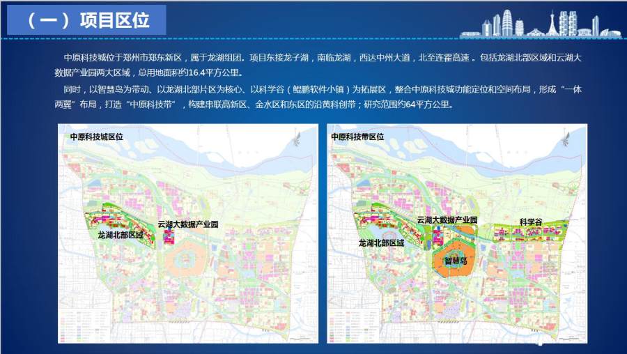 中原科技城位于郑州市区东部,区位优越,生态优美,总规划面积64平方公里,呈“一体两翼”布局,主要由核心区龙湖北部片区、先行区智慧岛和拓展区科学谷三大片区组成。“西翼”龙湖北部片区重点集聚高端人才和科研机构,规划布局五大产业板块;“东翼”科学谷突出鲲鹏生态、软件研发,打造科技创新示范区;“中部”智慧岛强化人才支撑,重点布局服务“两翼”孵化器,共同形成中原科技城科研、孵化、转化承接链,打造创新人才高度集聚、创新要素高度融合、创新活动高度活跃的全市新旧动能转换发动机、中原地区科技创新策源地和黄河流域高质量发展引领区,作为贯彻落实总书记黄河战略高质量发展的具体举措。