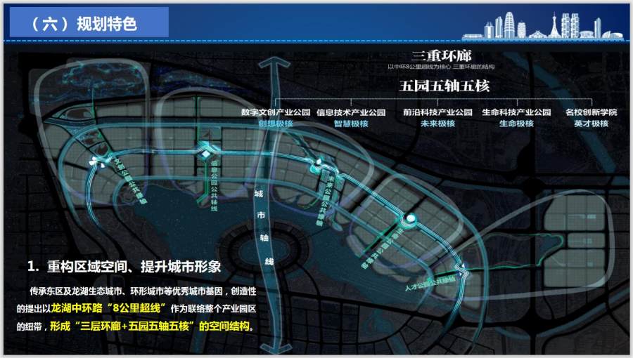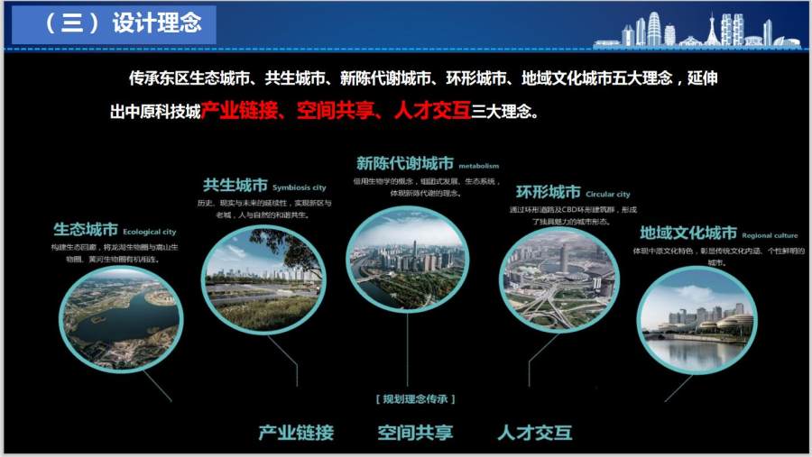 传承郑东新区规划管理思想,城市设计方案采用国际招标,2020年3月5日邀请国内外7家顶级设计团队启动设计,4月29日组织国内规划领域知名专家主持评审,8月6日正式确定设计方案。方案结合科创产业特点融入“产业链接、空间共享、人才交互”三大理念,形成“三层环廊+五园五轴五核”的空间布局,打造生产、生活、生态高度融合的创新创业新空间,塑造现代国际、时尚活力的智慧城市风貌。