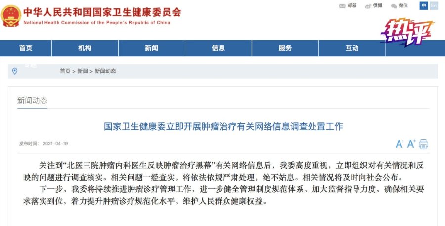 针对“北医三院肿瘤内科医生反映肿瘤治疗黑幕”一事,国家卫健委表示,将立即组织对有关情况和反映的问题进行调查核实,相关问题一经查实,将依法依规严肃处理,绝不姑息。