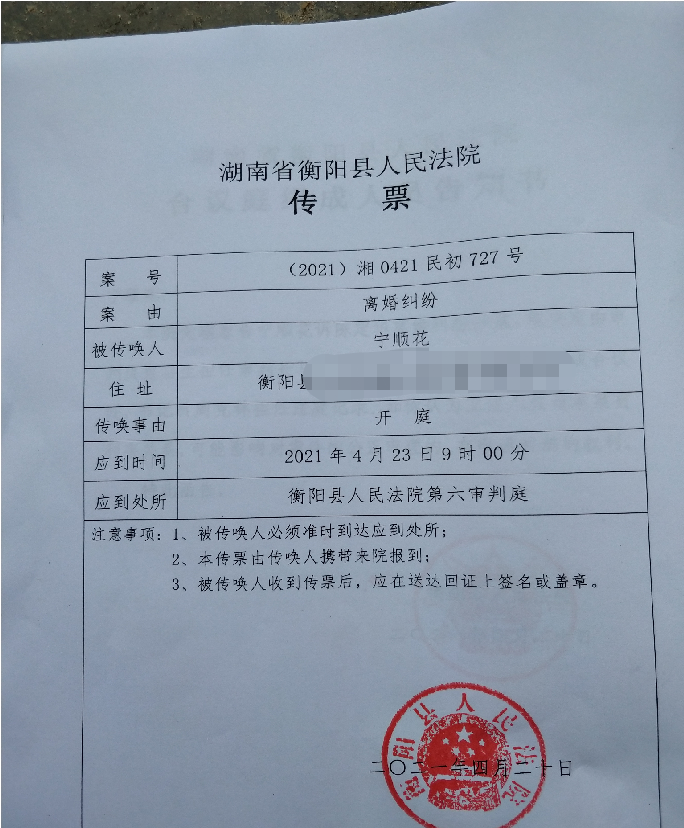 4月20日下午,正观新闻记者从“5年4次起诉离婚均遭驳回”事件当事人宁顺花处获悉,湖南省衡阳县人民法院将于4月23日上午九点开庭审理此案,这是宁顺花第五次起诉离婚。