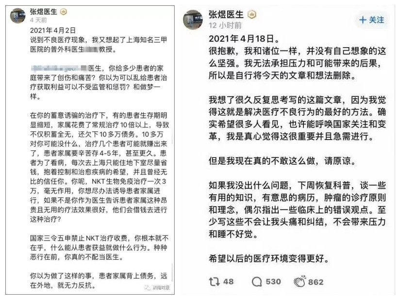 4月18日,自称北京大学第三医院肿瘤内科医生的“张煜医生”在网络平台发文揭露“肿瘤治疗黑幕”,爆料者很快就因“无法承担压力和可能带来的后果”自行删帖。