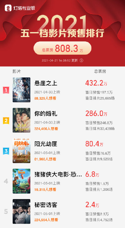 据灯塔专业版,目前预售票房《悬崖之上》领先,预售票房超过400万,其次为《你的婚礼》、《阳光劫匪》。