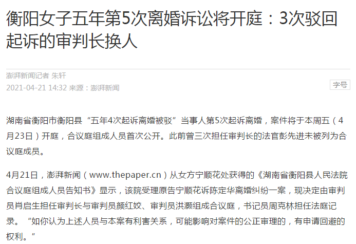 4月21日媒体报道,湖南省衡阳市衡阳县“五年4次起诉离婚被驳”当事人第5次起诉离婚,案件将于4月23日开庭。