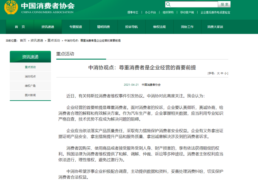 中消协也表示对特斯拉车主维权事件高度关注,认为企业经营的首要前提是尊重消费者。面对消费者的投诉,企业要认真倾听,真诚协商,给消费者合理的解释和有效解决方案。作为汽车生产者,企业掌握相关数据,应当利用专业知识严格自查,技术优势不应成为解决问题的阻碍。