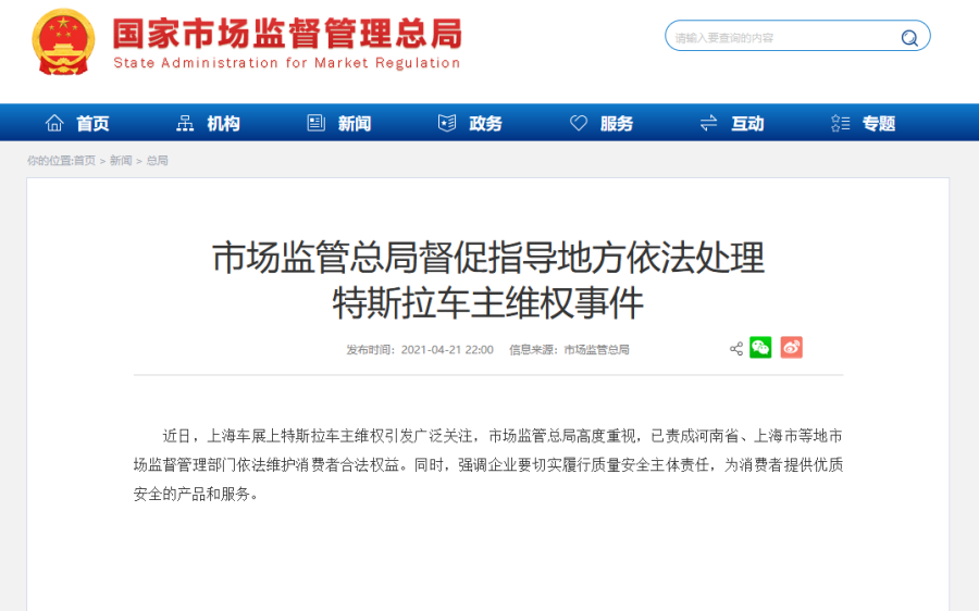 国家市场监督管理总局:督促指导地方依法处理特斯拉车主维权事件