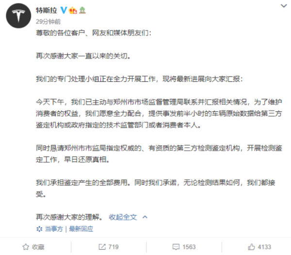 特斯拉官方微博21日晚发布声明称,公司已主动与郑州市市场监督管理局联系并汇报相关情况。公司愿意全力配合,提供事发前半小时的车辆原始数据给第三方鉴定机构或政府指定的技术监管部门或者消费者本人。特斯拉承担鉴定产生的全部费用,并且无论检测结果如何都会接受。