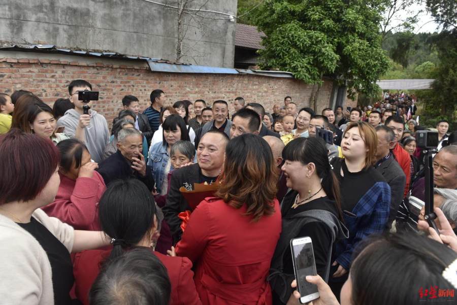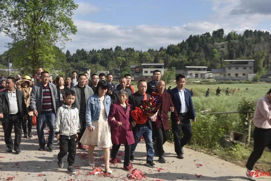 20日下午,王中清夫妇与儿子相认后,迫不及待地将儿子带回西平镇。在家中,他们早已准备好了坝坝宴,亲戚朋友、村民邻居,也早已在家中等候,他们等这顿团圆饭等了41年。当走到村口时,亲戚朋友为王远陆戴上了一朵大红花,当一幕幕的往事被提及,一家人的手紧紧地牵到了一起……