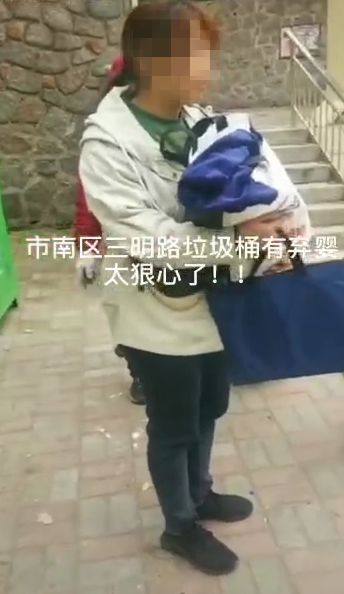 有网友爆料在青岛市南区三明路新世纪学校旁的垃圾桶上捡到一名弃婴。捡到时,婴儿呈熟睡状,并被蓝色衣物包裹。知情人称,是一位孩子家长在接孩子放学时偶然在三明路发现的。
