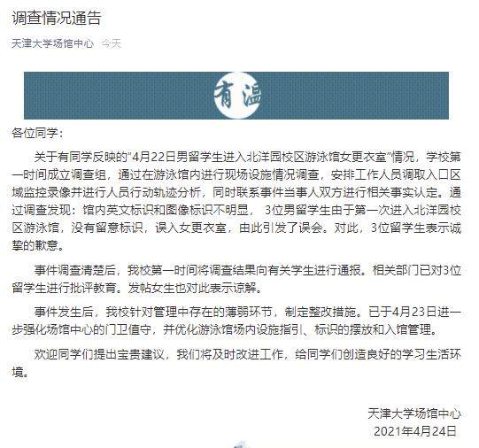 天津大学场馆中心微信公众号4月24日通告称,关于有同学反映的“4月22日男留学生进入北洋园校区游泳馆女更衣室”情况,学校第一时间成立调查组,通过在游泳馆内进行现场设施情况调查,安排工作人员调取入口区域监控录像并进行人员行动轨迹分析,同时联系事件当事人双方进行相关事实认定。通过调查发现:馆内英文标识和图像标识不明显, 3位男留学生由于第一次进入北洋园校区游泳馆,没有留意标识,误入女更衣室,由此引发了误会。对此,3位留学生表示诚挚的歉意。