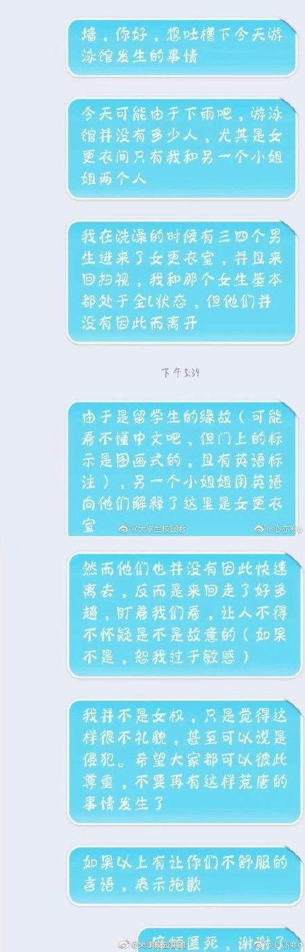 4月22日,天津大学一女学生在网络上发帖称,自己学校的几名男留学生闯入女更衣室。