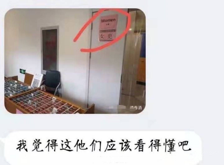 女生表示更衣室门上的标识是图画式样,且标注有英文