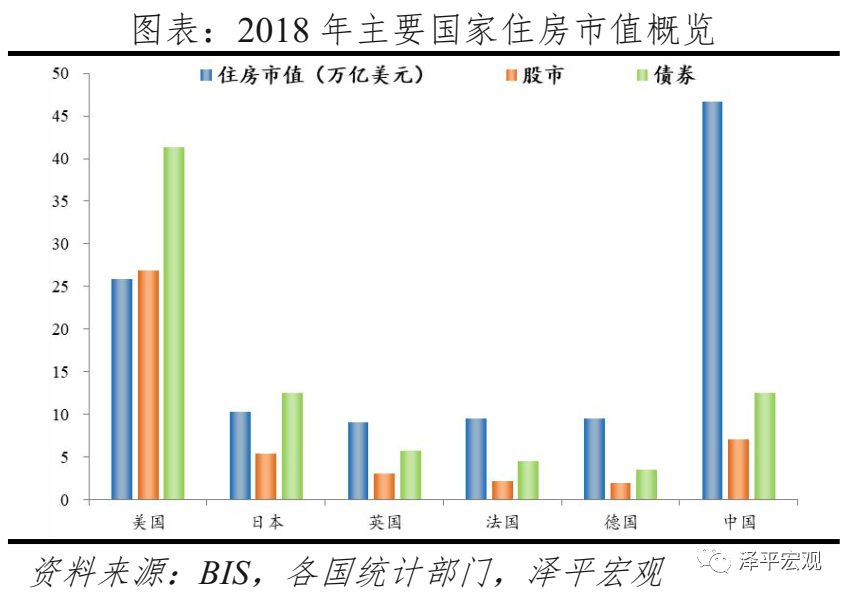 中国住房市值在国际处于什么水平?1)与发达国家相比,中国住房市值及与GDP、股债房市值的比例均较高,但人均住房市值低。从住房市值看,2018年中国为46.7万亿美元,明显大于美国的25.8万亿美元、日本的10.3万亿美元、英法德三国合计的28.0万亿美元。从住房市值与GDP的比例看,2018年中国为356%,高于美国的126%、日本的208%、德国的238%、英国的320%、法国的341%。中国住房市值及其与GDP比例较高源于人地错配、供求失衡以及货币超发,一二线高房价,三四线高库存,导致全国住房市值高。按照“人往高处走、人随产业走”的经济规律和国际经验,中国人口长期大量向都市圈集聚,但在“控制大城市规模、重点发展小城镇、区域均衡发展”的计划经济思维误导下,人地严重错配,一二线城市人口流入但土地供给严重不足导致高房价,三四线城市人口流出但土地供给过多导致高库存,进而导致全国住房市值较高。从住房市值占股债房市值的比例看,2018年中国为71%,高于美国的28%、日本的37%、英国的51%、法国的58%、德国的66%。但从人均住房市值来看,2018年中国为3.3万美元,远低于美国、日本、英国、法国、德国的7.9、8.1、13.6、14.1、11.5万美元。中国住房市值与股债房市值的比例较高还在于中国资本市场发育不成熟,直接融资比例较低,导致股票、债券市值较低。2)与发达国家相比,中国居民家庭配置房产比例较高。2018年中国居民家庭住房资产在家庭总资产中占比达到57%,高于英国的49%、日本的37%、美国的24%、德国的22%。在中国较高房产比例的另一面,则是较低比例的金融资产配置。2018年中国居民金融资产配置占比为40.4%,远低于美国的70.6%、日本的63.9%、英国的53.4%,略高于法国的39.2%。
