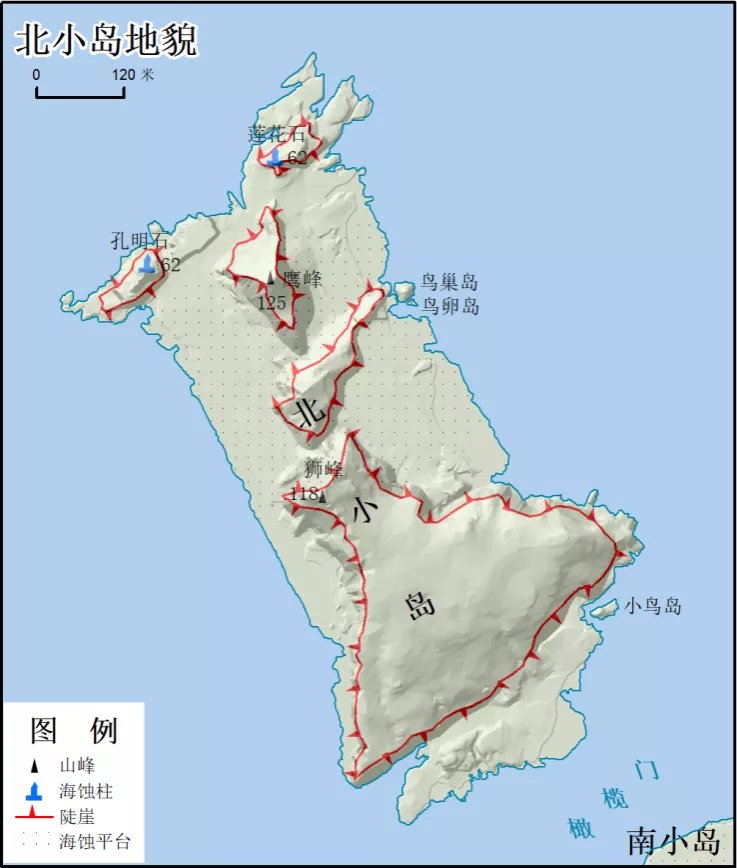 北小岛属侵蚀剥蚀丘陵地貌,地形起伏较大,海岸类型为基岩海岸,海蚀作用强烈,发育有海蚀崖、海蚀平台、海蚀柱等海蚀地貌。
