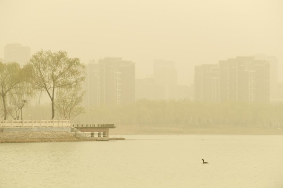 上图:3月底,我国北方地区遭遇沙尘天气,图为候鸟在宁夏银川市陈家湖湖面上游弋。(新华社记者冯开华/摄)