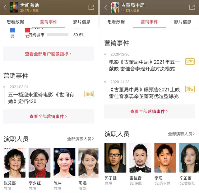 其中,《古董局中局》和《悬崖之上》两家影片的出品方都是英皇电影,没有必要同场竞技,相互消耗,目前《悬崖之上》已开始点映,而《古董局中局》没有任何动静,猫眼专业版上,最近一次营销事件还在去年年底;《世间有她》也在今年3月1日发布定档预告后就再无动静,官方微博也无相关宣发。就两部影片的阵容而言,这样的物料发布频率并不寻常。