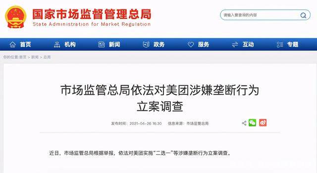 近日,市场监管总局根据举报,依法对美团实施“二选一”等涉嫌垄断行为立案调查。