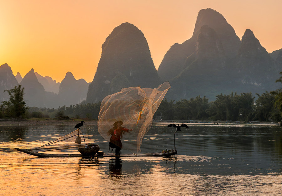 2018年3月28日,广西桂林,漓江渔夫夕阳下捕鱼。
