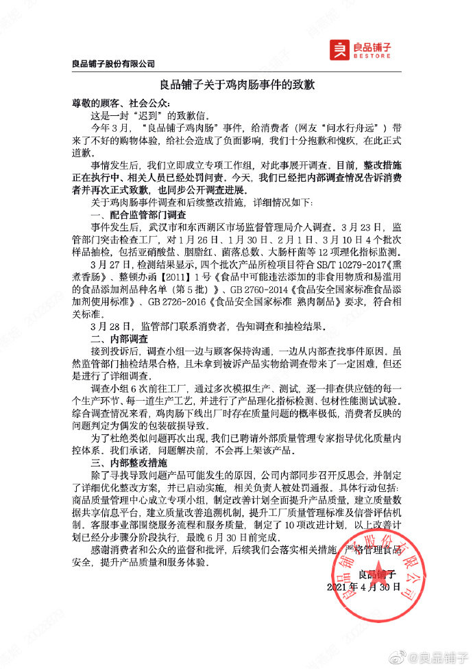 针对良品铺子鸡肉肠一事,今天,@良品铺子 发布消息,称这是一封“迟到”的致歉信,已将调查结果告知消费者并再次正式致歉,也同步公开调查进展。