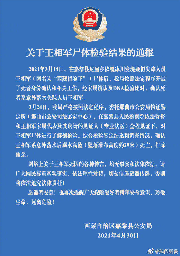 4月30日晚,西藏嘉黎县公安局通报“西藏冒险王”王相军尸体检验结果:系意外落水溺亡