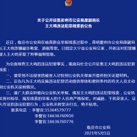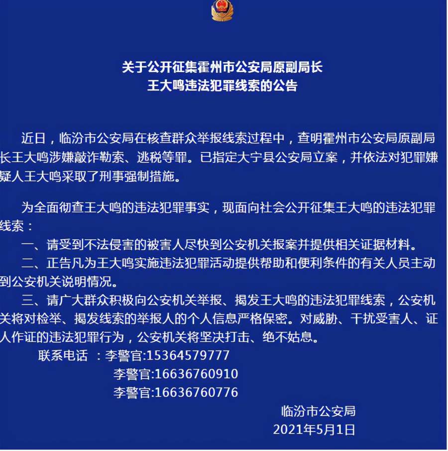 5月1日,山西临汾市公安局发布关于公开征集霍州市公安局原副局长 王大鸣违法犯罪线索的公告:
