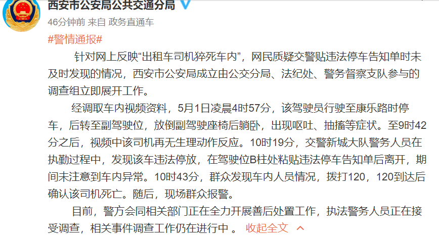 据@西安市公安局公共交通分局微博消息,针对网上反映“出租车司机猝死车内”,网民质疑交警贴违法停车告知单时未及时发现的情况,西安市公安局成立由公交分局、法纪处、警务督察支队参与的调查组立即展开工作。