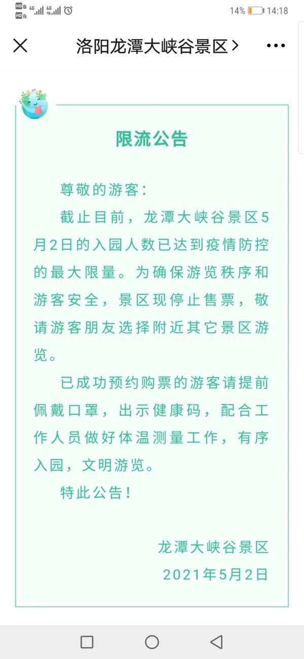 老君山、清明上河园等多景区发出限流公告,请游客错峰出游、提前预约购票