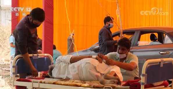 在新德里的隔离中心外,病人只能共用放在车辆里的氧气罐,排队等候治疗。