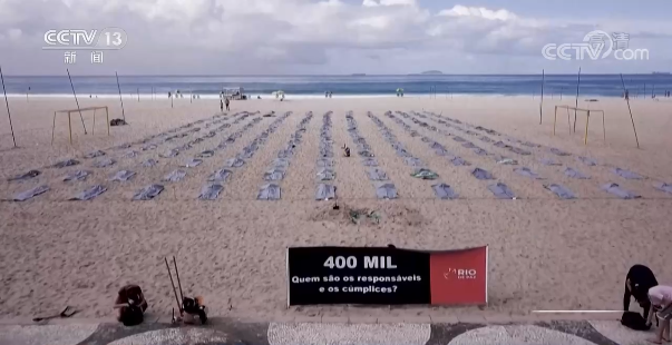 4月30日,在巴西里约热内卢的科帕卡巴纳海滩摆放了400只运尸袋,提醒世界关注南美疫情。